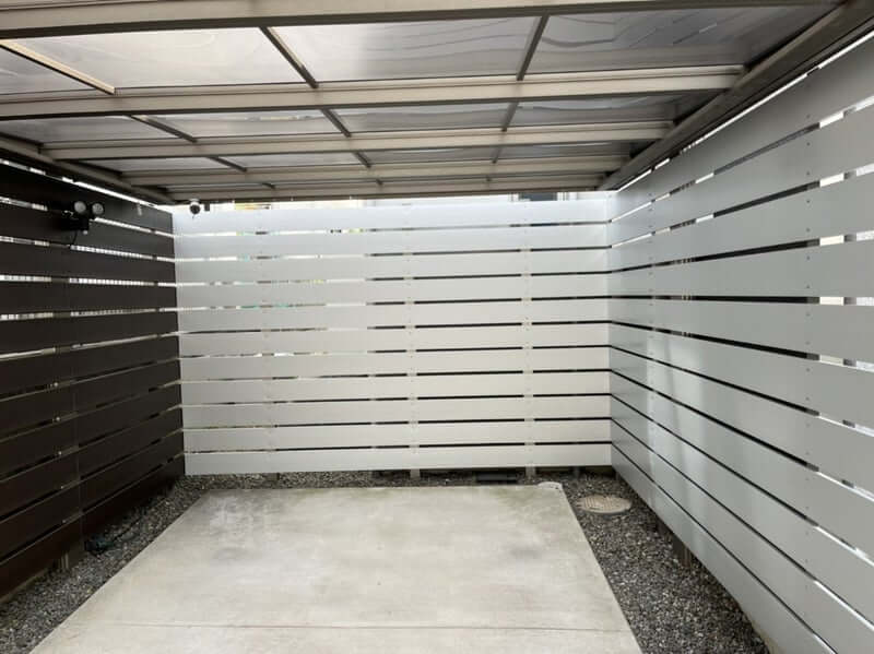 フェンスは、お隣との境界側に以前取り付けていたものと同じ商品を使用し、今回は色を変えて設置しています。建物や周囲の雰囲気に合わせたカラーを選ぶことで、統一感を保ちつつ、少し印象を変えることができました。